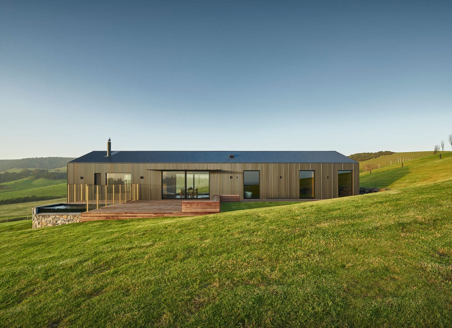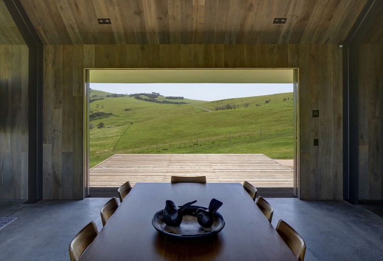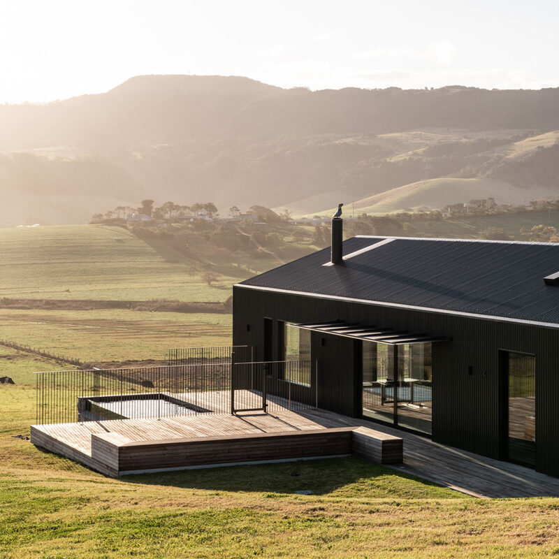 The nearby gabled guest house, designed to reference a traditional farm shed, required equally considered craftsmanship. Clad in corrugated black metal, the structure terminates in a fully glazed end wall fitted with operable copper louvres. Our work ensured these elements were precisely integrated, enabling flexible control of light, ventilation, and views while maintaining a refined finish. Across both buildings, the carpentry balances strength, durability, and detail, supporting architecture that is both robust enough for its exposed coastal setting and finely tuned to its remarkable surroundings.