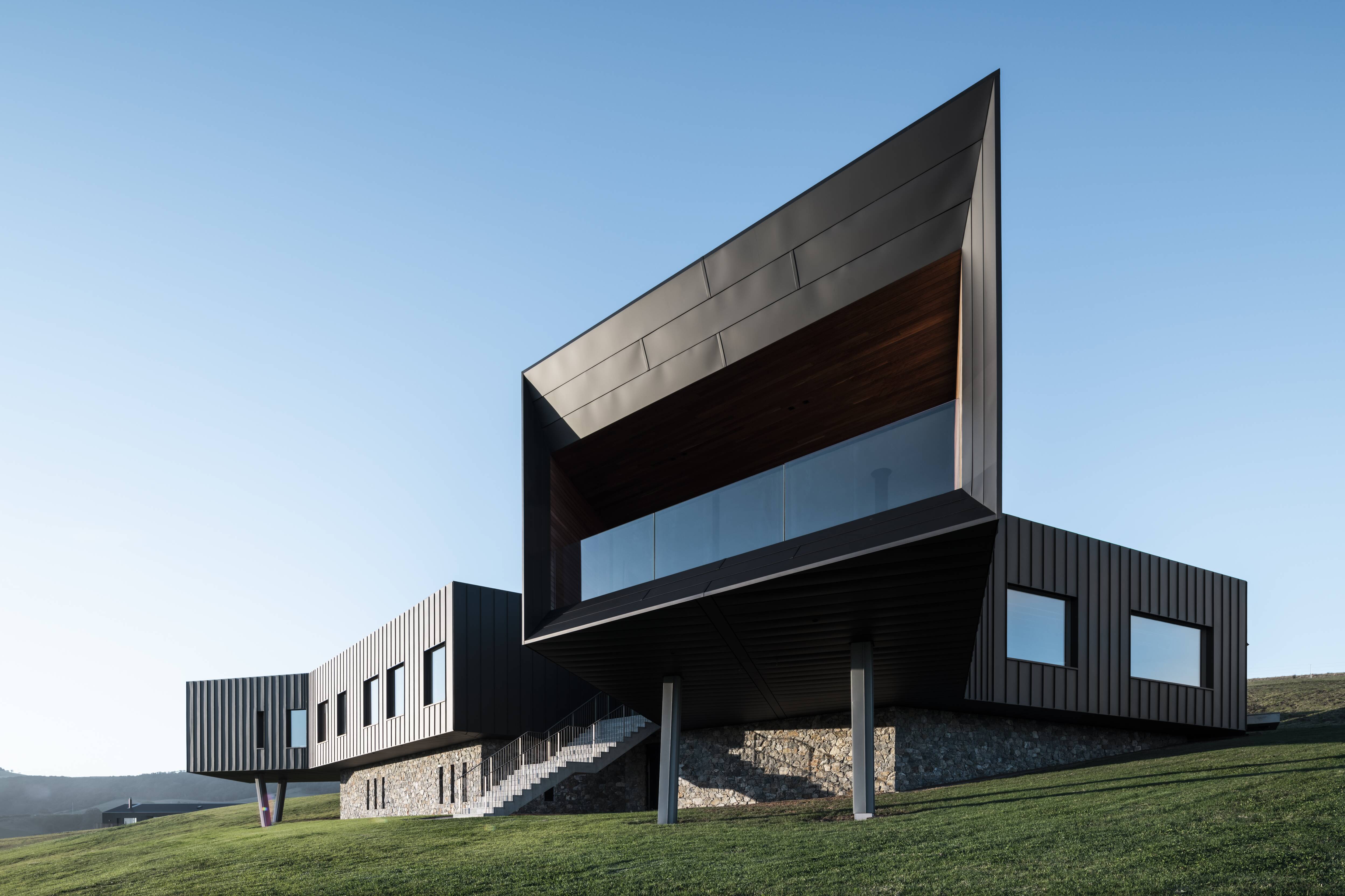 Set atop a 150-acre coastal headland where the Illawarra escarpment meets the sea, Headland House and Escarpment House command expansive views over Werri Beach and Geering Bay. The site is defined by strong contrasts—open dairy pastures to one side and rugged cliffs to the other—while the eastern boundary has been gifted to the community, forming part of the Gerringong to Kiama Coast Walk. The architecture responds to this unique setting through a series of metal-clad volumes arranged around a protected courtyard, with projecting elements carefully aligned to capture ocean and rural vistas.